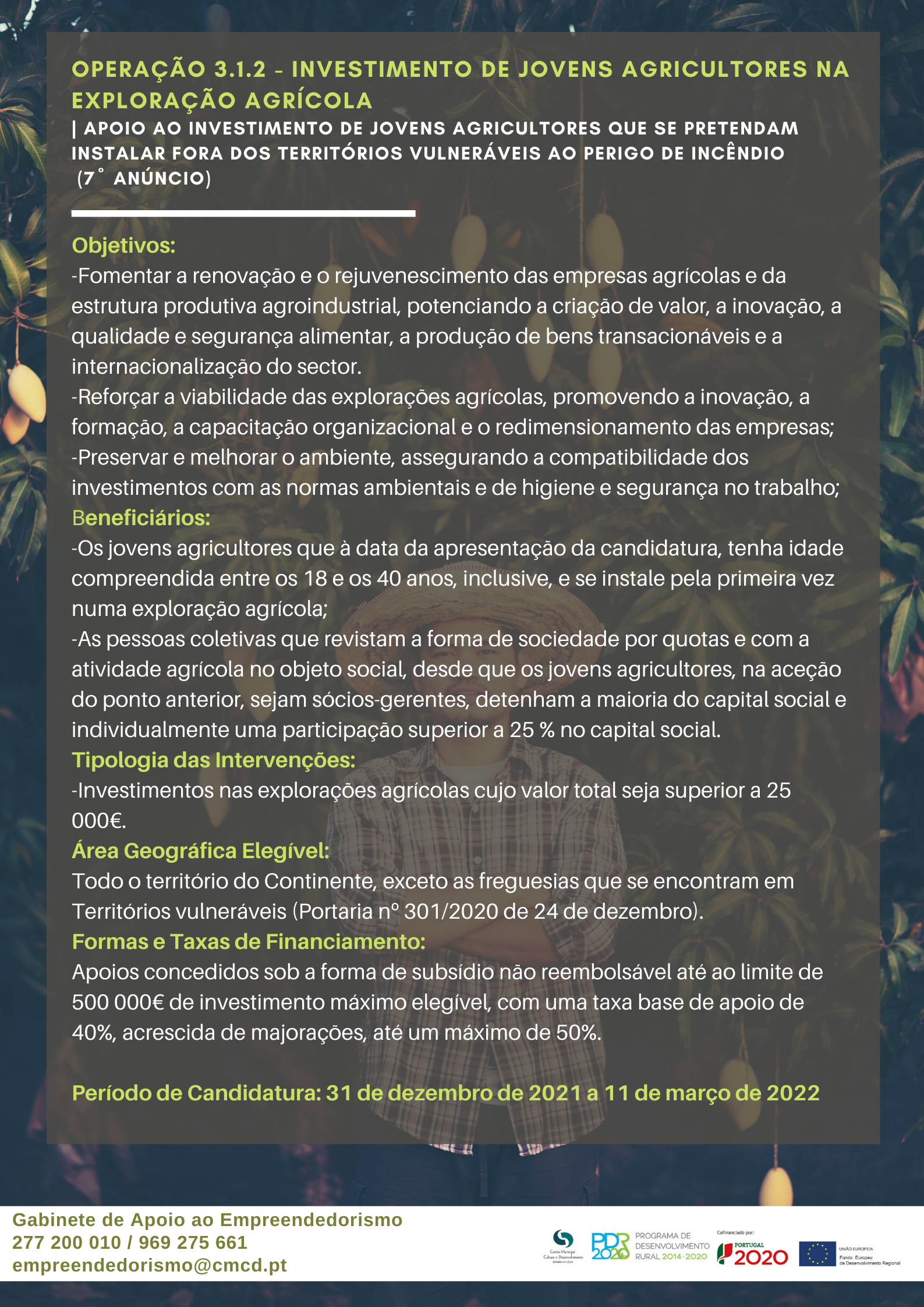 Operação 3.1.2 - Investimento de jovens agricultores na exploração agrícola APOIO AO INVESTIMENTO DE JOVENS AGRICULTORES QUE SE PRETENDAM INSTALAR FORA DOS TERRITÓRIOS VULNERÁVEIS AO PERIGO DE INCÊNDIO